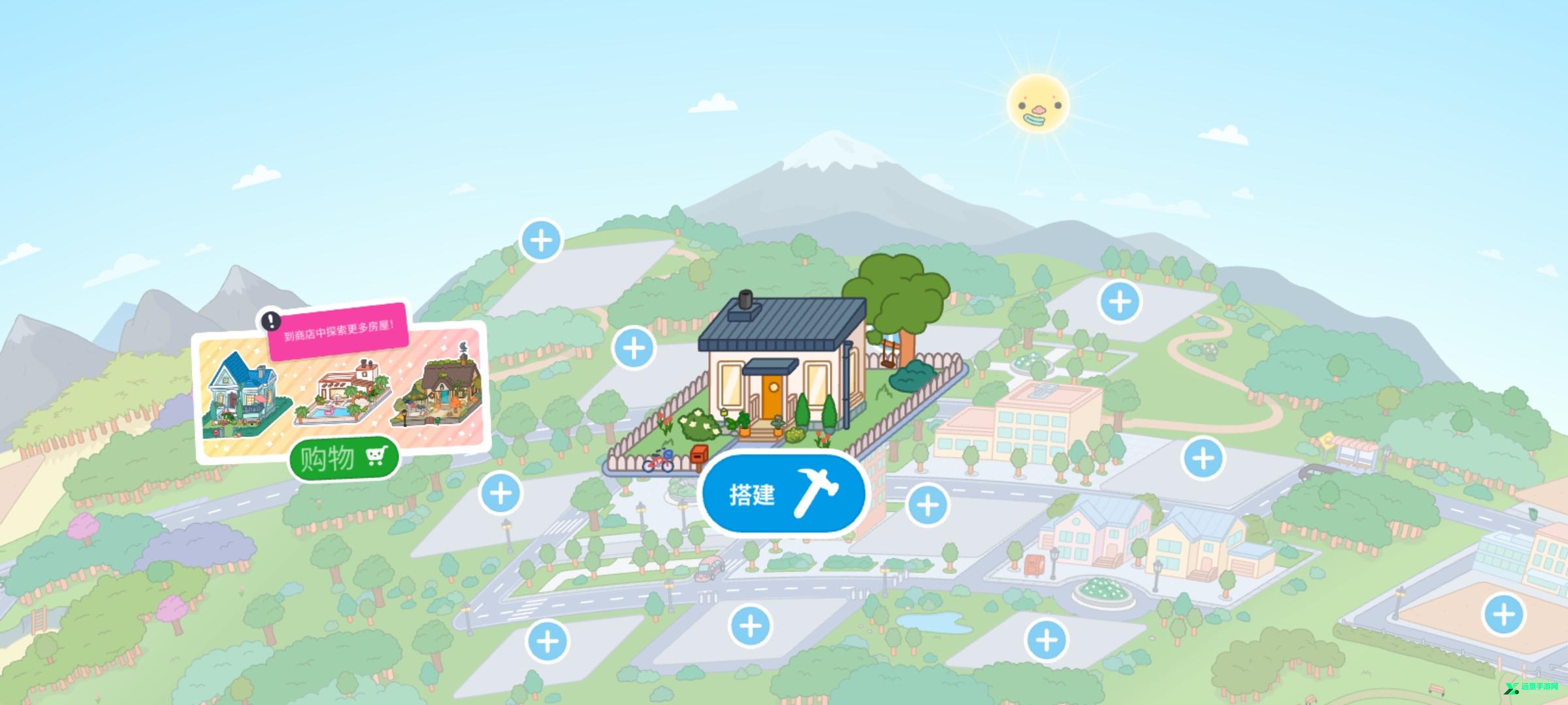 2、点击+号选择一个你喜欢的地方,点击你想搭建的房子,也可以前往商店购买其他房型,搭建完成后点击房子进入内部开始装修。