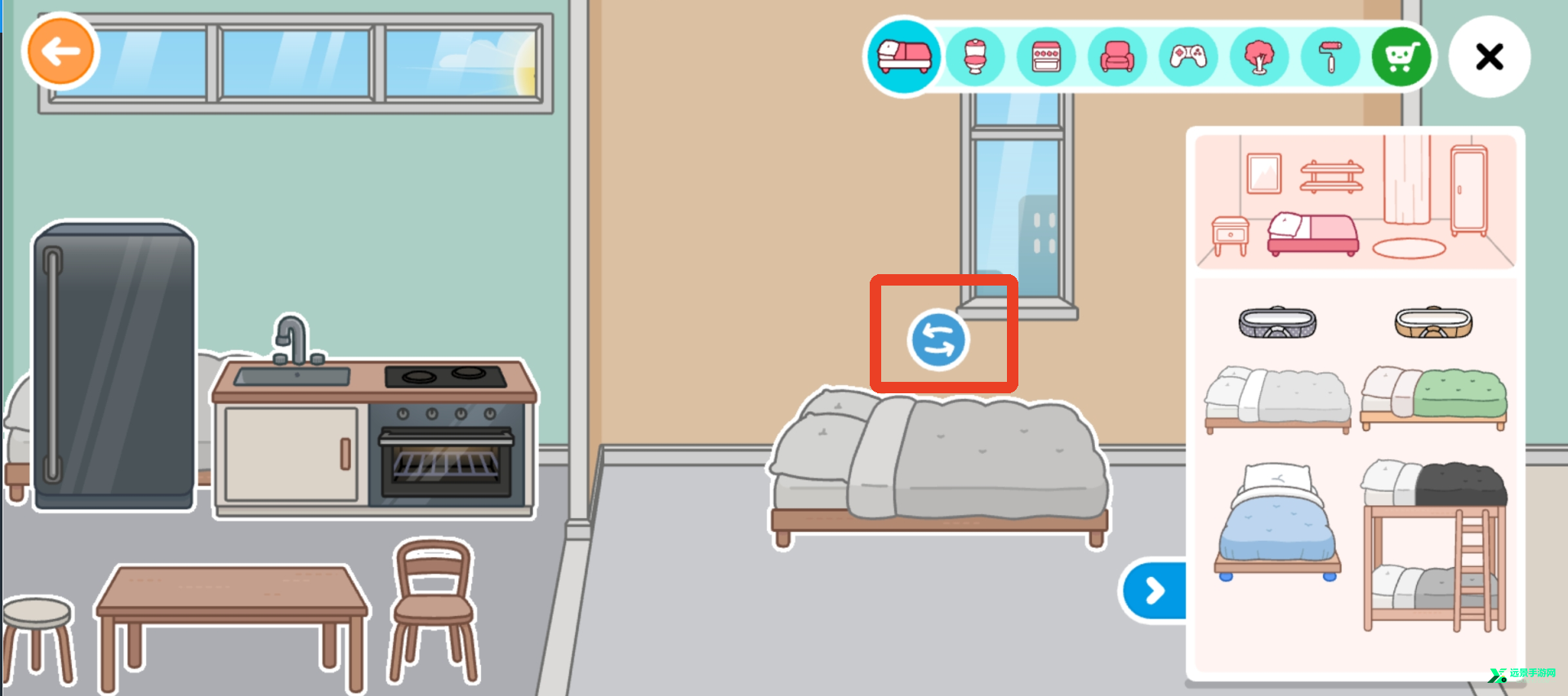 4、点击家具按钮,选择你喜欢的家具拖动放置,点击家具上方箭头可以更换方向。