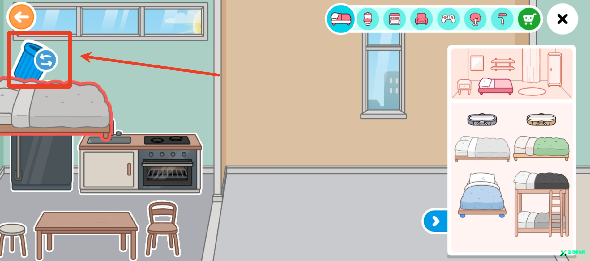 5、家具选择错了也没有关系,拖动到左上角垃圾桶位置就可以删除。
