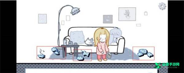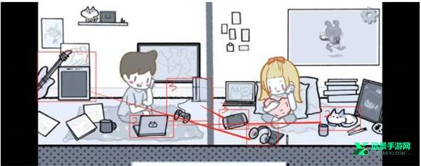 8、点两个人共同有的东西,包括两人的游戏机、吉他和耳机还有两只猫咪,除了3个物品外还有3个深层话题,需要连续滑动鼠标滚轮;