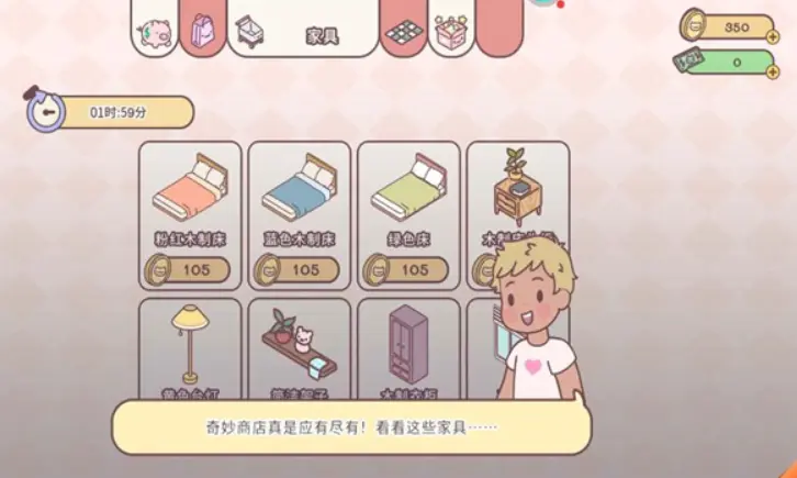1.完成任务领取金币奖励,可以在商店中购买各种家具和屋内的装饰品