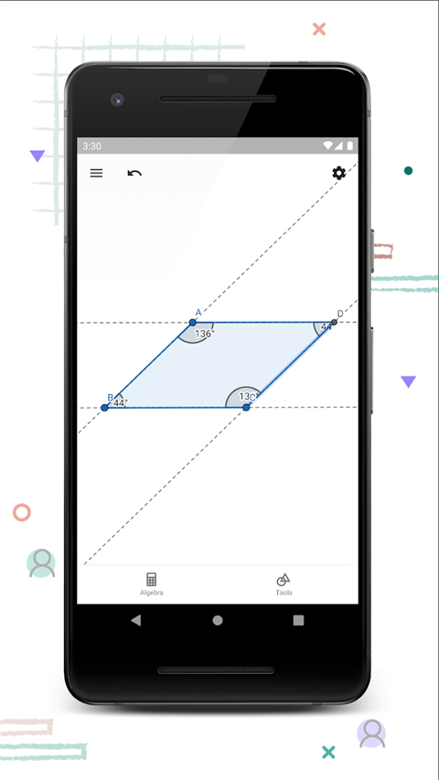 Geometry 是一款几何图形分析与绘图工具,主要提供图形测量与几何作图两类核心功能。该软件通过图像识别技术,支持用户使用设备摄像头拍摄实物照片,进而对画面中的非规则图形进行轮廓识别与面积估算。在作图模块中,软件提供了多种几何构建工具,允许用户进行点线面的自由绘制与约束操作。其叠加作图功能支持在不同图层上进行图形组合,并通过辅助线、角度标注等工具保证作图的精确性。
