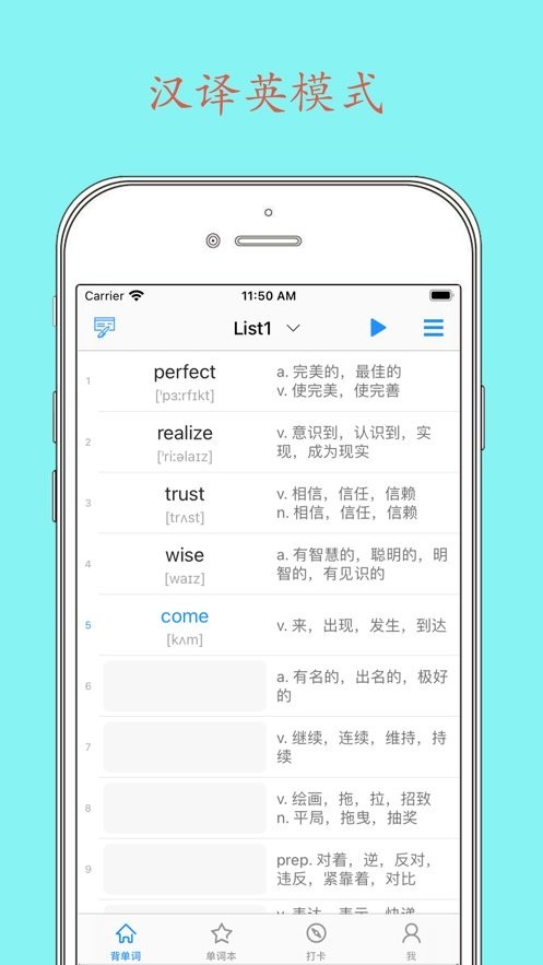2.学习模式:双语、英译汉、汉译英、听写等多种模式