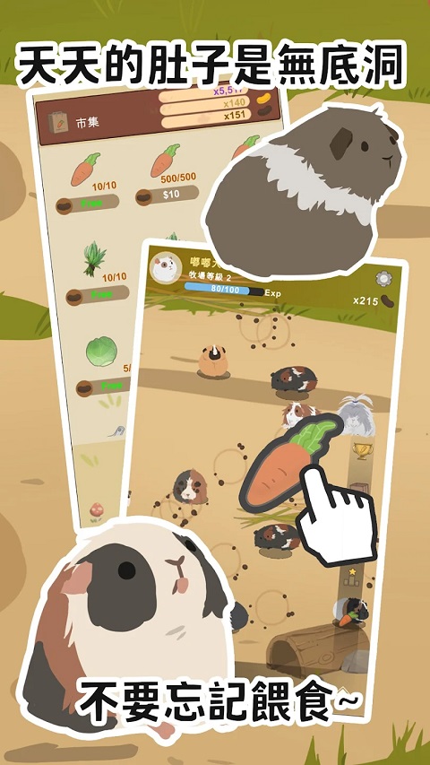 天竺鼠农场官方版是一款有趣的宠物养成游戏,玩家需要照顾多只有不同花色、品种与个性的天竺鼠,通过定期的喂食,清洁鼠窝以及抚摸玩耍等行为建立亲密度。当亲密度到达一定成都的时候,就可以通过这些天竺鼠获得资源,用于购买装饰品来自由布置农场环境。游戏支持离线收益,即使退出游戏,部分生产与成长进程仍会持续,减少玩家养成时间。