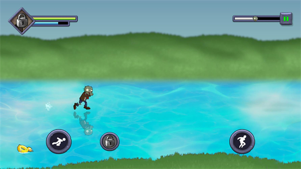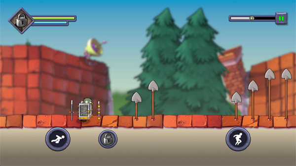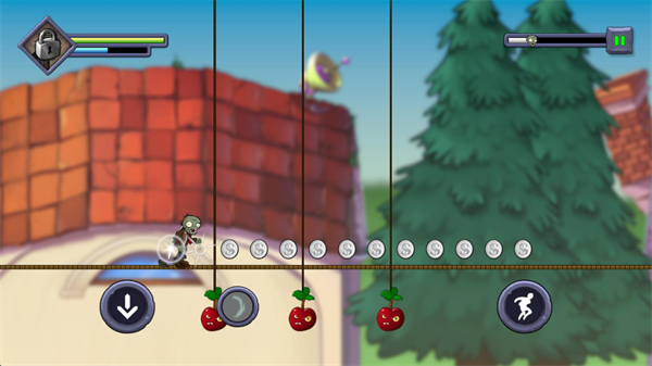 3.进入关卡后僵尸会自动前进,在屏幕左右的上下分别是跳跃和切换方向,有时向下的按键会变成冲刺