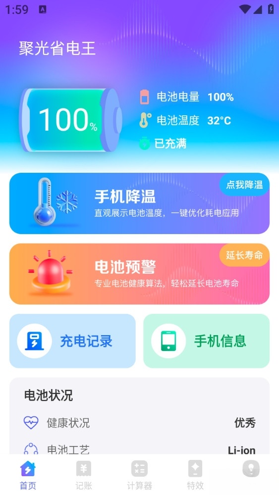 聚光省电王app是一款专门针对手机的电池管理和监测优化工具,这款软件的主要功能室对用户手机的电量和各种功耗进行实时监控,及时的发现后台高耗电量的应用进行及时的管理。聚光省电王app会提供一键省电模式快速调整系统设置以降低能耗。软件通过分析应用的耗电行为与系统耗电构成,协助用户了解电池使用状况,并提供相应的优化建议或自动清理选项。