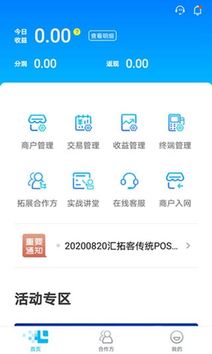 汇拓客安卓版是一款移动互联网运营工具,在汇拓客安卓版中,主要用于商户管理、交易监控、终端设备管理和收益结算等核心业务功能,支持商户的进件、信息变更和入网审核。用户可以实时查看交易明细与状态,可查询、划拨和回调POS机具。软件内还有知识讲堂功能,可以进行业务培训,有需求的用户试试看汇拓客安卓版吧!