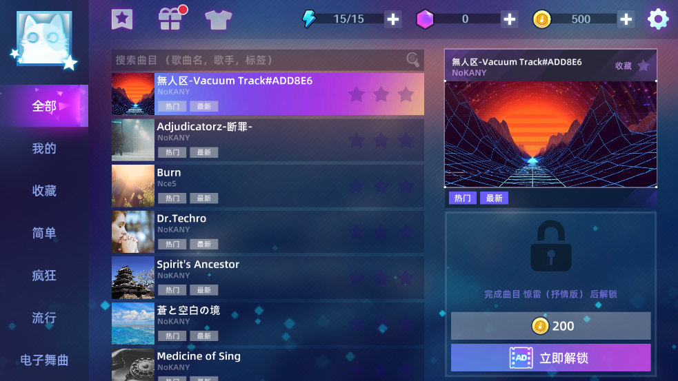 2、海量丰富的音乐供你选择,每一个曲目都有着不同的冒险难度供你选择;