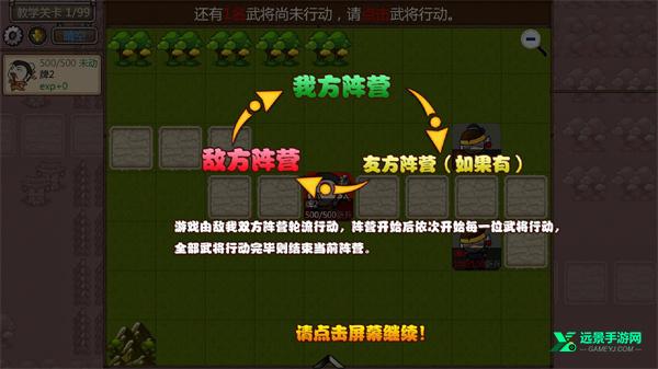 每关有多名武将登场,分别由玩家阵营和电脑车营组成两个阵营进行交替的行动,当玩家行动开始时,玩家可以点击任意一名武将进行行动,武将行动完毕后进行其他尚未行动的武将行动,所有武将行动完毕点击结束回合轮到电脑行动电脑行动完毕后又开始玩家回合循环交替。