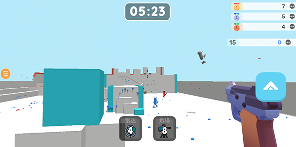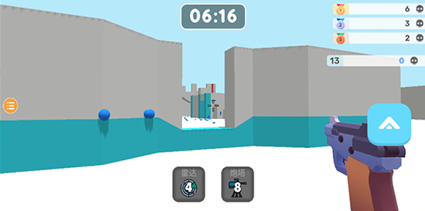 3.开始游戏,左边滑动可控制方向,右边滑动可控制视角,点击右边蓝色向上的箭头可跳跃,杀死4个敌人可获得雷达,杀死8个敌人可获得炮塔
