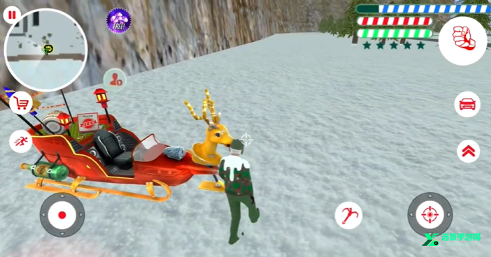 1、游戏一开始,从驯鹿的雪橇车上走下来。