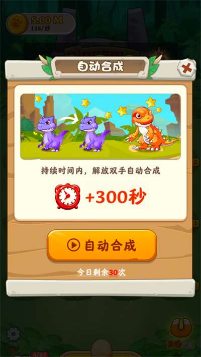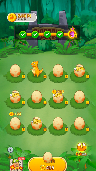 只需将两只相同等级的小恐龙拖拽碰撞,即可瞬间升级进阶,单手即可完成全部操作,零门槛上手,三秒学会核心玩法。