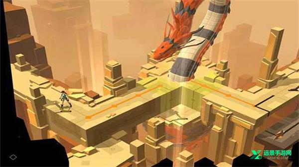 顺利来到场景二,我们不要因为巨蟒的再次出现而慌了阵脚,事实上在这个关卡巨蟒是不会被杀死的只能被击退,所以小伙伴们可以见怪不怪了。首先我们要扳动黑色机关按钮,让处在黑色移动平台上的毒蛇向前方移动,这样我们可以顺利击杀挡在我们面前的第一条毒蛇。但是第二条毒蛇依然正对着我们即将走过的路线,思考一下发现只能用巨蟒的袭击干掉它。将黑色机关扳回原位,我们再走到巨蟒的攻击路线上,成功吸引巨蟒的注意后后撤一步,这个时候巨蟒会将眼前道路上的所有东西吞噬干净,待巨蟒走远后跳下平台即可。