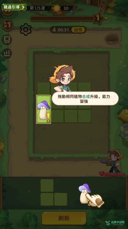 1、将植物拖拽到格子中进行布置,相同类型的植物可以合成升级,提升战斗能力。