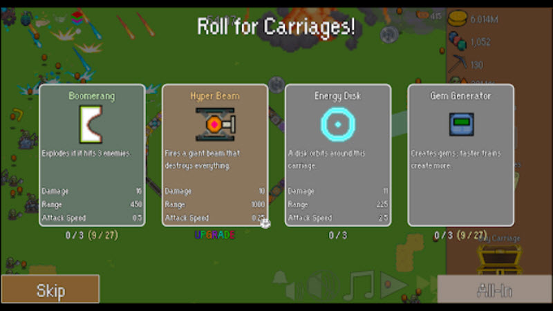 战斗中,击败出现的敌人后会掉落宝石,这些宝石将由面包师自动转换为金币,帮助你进一步提升火车的战斗力。