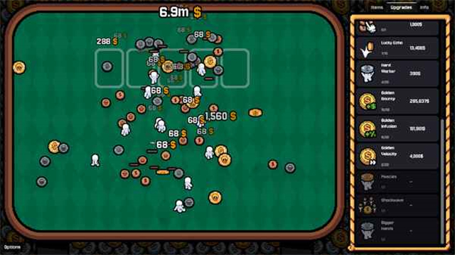 你拥有的硬币越多,就能抛得越多。购买升级,使它们抛掷得更快并产生更多收益。探索不同硬币类型之间奇妙的互动与意想不到的协同效应。