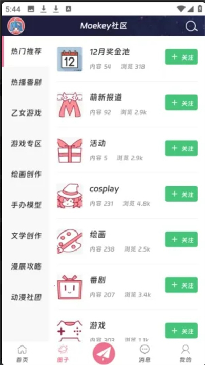 按番剧、乙女游戏、绘画创作、手办模型、漫展等主题划分垂直社区,用户一键关注即可获取该领域最新动态与热门讨论。