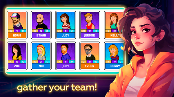 雇佣不同专长的员工(编程/设计/美术/音效),分配工作任务并支付工资;升级办公设备、扩大工作室面积、搬迁至更豪华的地段,体验从车库到写字楼的阶级跨越。