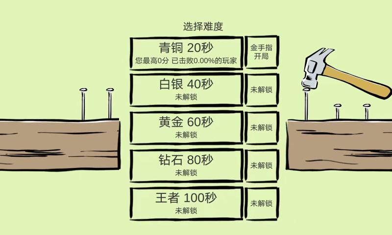 敲钉子游戏是一款休闲的单机小游戏,在游戏里为玩家提供了青铜、白银、黄金、钻石以及王者5个不同的难度选择,每个难度拥有不同的时限限制,你可以在规定的时间内在木桩上钉下尽可能多的钉子来获取到更高的分数,你的分数将会被记录在不同难度的排行榜上。在敲钉子游戏安卓版中,通过点击左侧屏幕来在木桩上放置钉子,点击右侧屏幕来使用锤子进行敲击,当你钉子放空或把钉子锤歪时游戏即刻结束并记录你的分数。