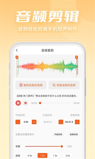 1、便捷编辑:用户可以在手机上轻松完成音频剪辑工作,无需复杂的操作。