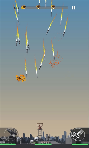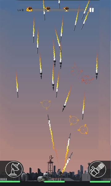 导弹拦截是一款竖屏的射击闯关类手游,在游戏里你将化身为军事基地的指挥官,面对从天而降的导弹,你需要通过发射基地的导弹以及防护罩来应对,避免你的基地遭受到大面积的打击。在导弹拦截手机版中,拥有海量关卡提供给玩家挑战,随着关卡的推进,导弹的数量会越来越多,对玩家的策略考验也越来越大,在每一关通关时根据玩家所剩血量给予不同的星级评分。