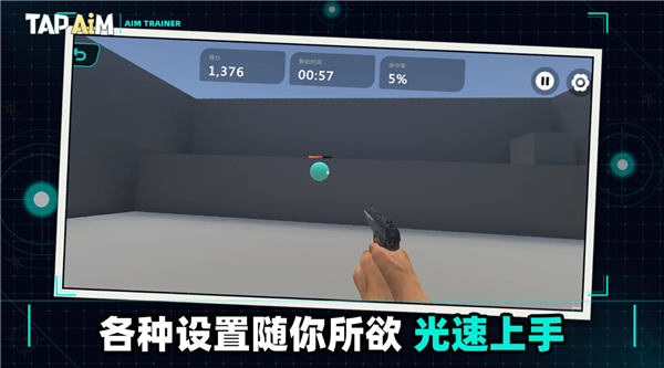 TapAim练枪通过固定靶训练来提升精准度,移动靶训练用于增强跟枪技巧,而多向飞碟训练则用于预判能力的提高,每一种训练都具有很强的针对性。你可以自定义目标的数量、速度以及生命值,以此来模拟不同的游戏场景。命中率、首枪时间以及偏差像素等六类数据能够量化你的进步。